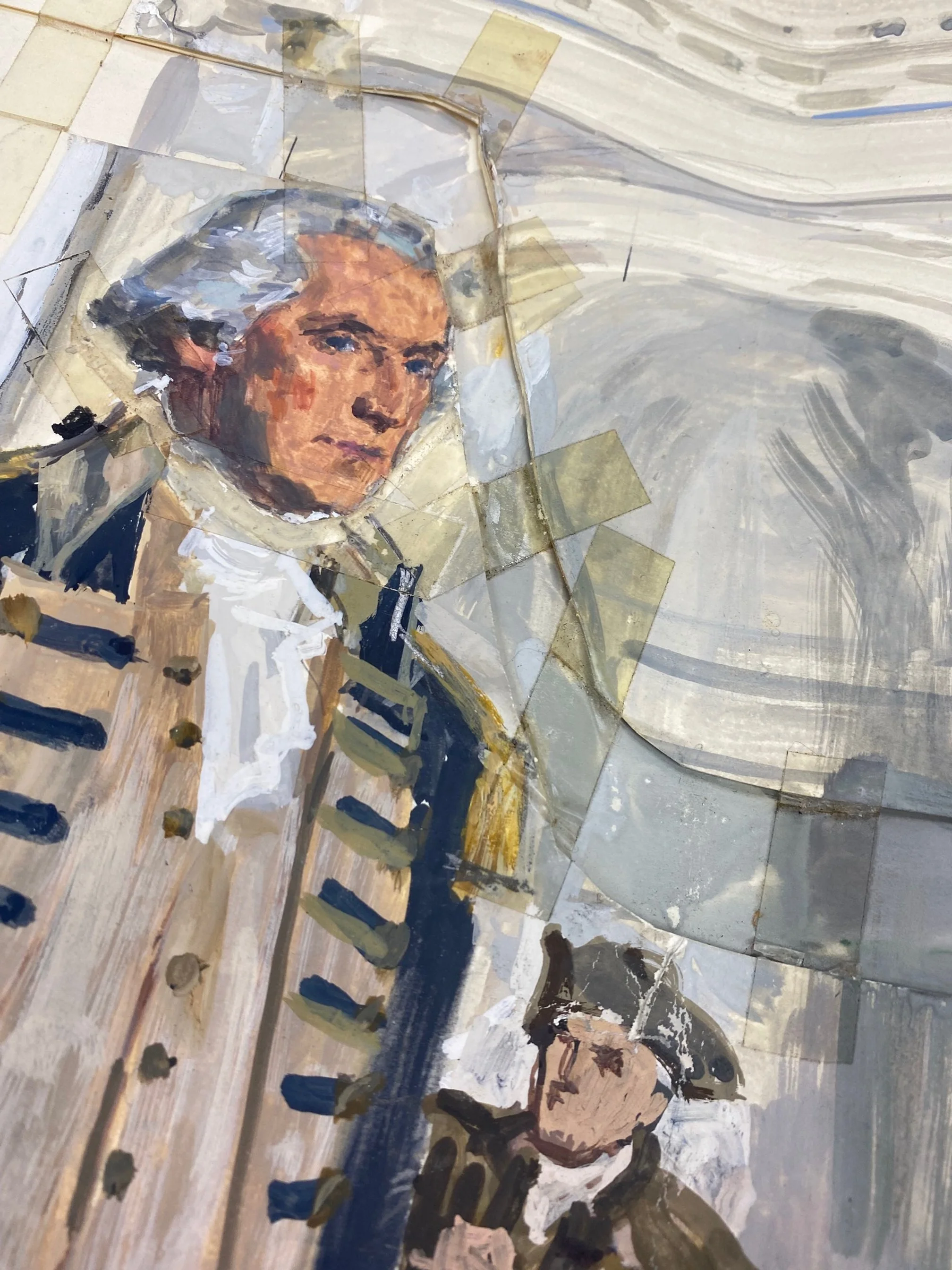 Detail showing the artist's painting technique. Note the fragility of Smith's heavy application of paint in the document under Washington's hand and the tricorn hat of the patriot sitting at the table in background.